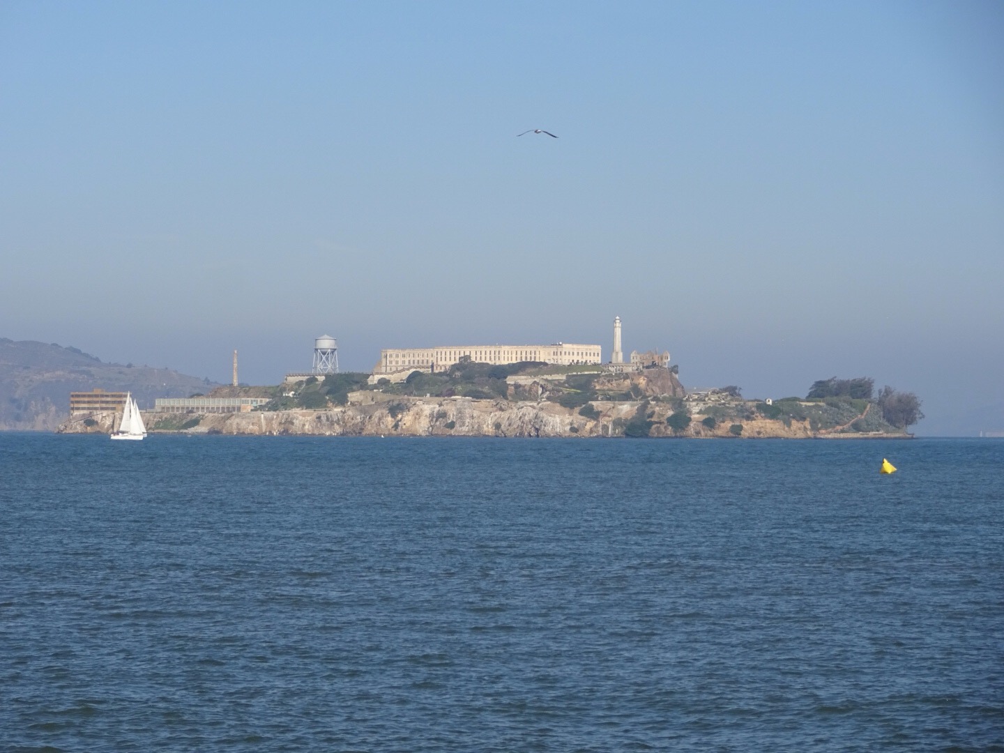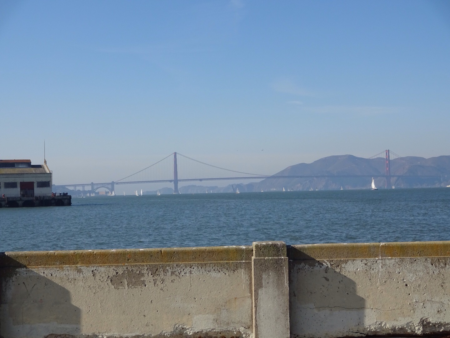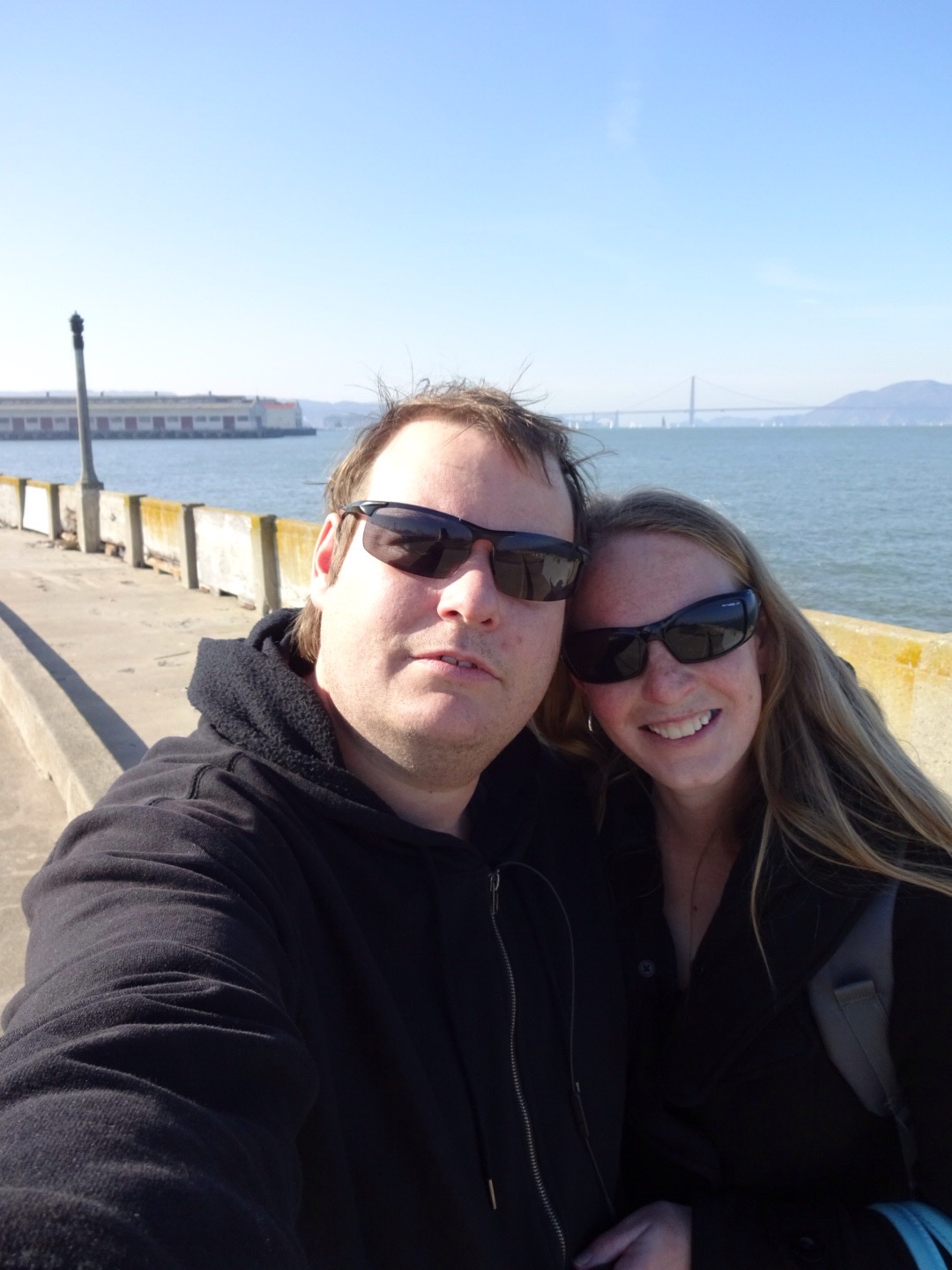 Today we decided to take the shuttle to the airport and catch the train from there. There are a number of public transport options, the train we were on today is called Bart. Once in town we caught an old street car down to the piers closest to the bridge and walked from there. We couldn’t see much due to the smog so the photos might be a bit unclear, but it’s there! We also saw the Island of Alcatraz, but you need to book weeks in advance to actually go there, so we only saw the island from the mainland.